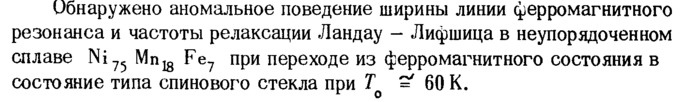 Обнаружено аномальное поведение ширины линии ферромагнитного резонанса и частоты релаксации Ландау Лифшица в неупорядоченном сплаве Ni?5 Mnjg Fe7 при переходе из ферромагнитного состояния в состояние типа спинового стекла при Τ = 60 К.