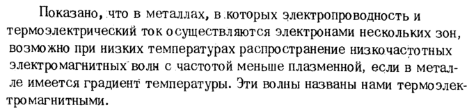 Показано, что в металлах, в которых электропроводность и термоэлектрический ток осуществляются электронами нескольких зон, возможно при низких температурах распространение низкочастотных электромагнитных волн с частотой меньше плазменной, если в металле имеется градиент температуры. Эти волны названы нами термоэлектромагнитными.
