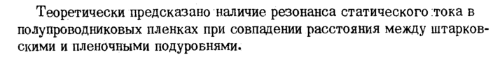 Теоретически предсказано наличие резонанса статического тока в полупроводниковых пленках при совпадении расстояния между штарков скими и пленочными подуровнями.