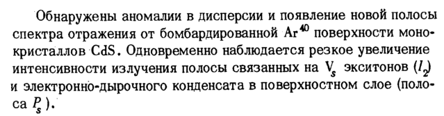 Обнаружены аномалии в дисперсии и появление новой полосы спектра отражения от бомбардированной Аг40 поверхности монокристаллов CdS. Одновременно наблюдается резкое увеличение интенсивности излучения полосы связанных на Ws экситонов (1^ и электронно-дырочного конденсата в поверхностном слое (поло-ал ξ):