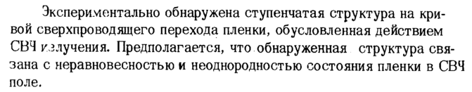 Экспериментально обнаружена ступенчатая структура на кривой сверхпроводящего перехода пленки, обусловленная действием СВЧ излучения. Предполагается, что обнаруженная структура связана с неравновесностью и неоднородностью состояния пленки в СВЧ поле.