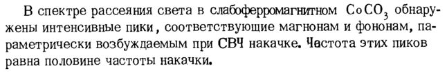 В спектре рассеяния света в слабоферромагнитном СоС03 обнаружены интенсивные пики, соответствующие магнонам и фононам, параметрически возбуждаемым при СВЧ накачке. Частота этих пиков равна половине частоты накачки.