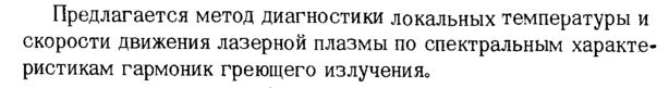 Предлагается метод диагностики локальных температуры и скорости движения лазерной плазмы по спектральным характеристикам гармоник греющего излучения»