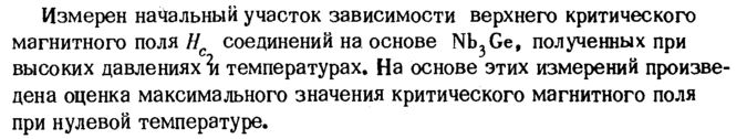 Измерен начальный участок зависимости верхнего критического магнитного поля Нс соединений на основе Nb3Ge, полученных при высоких давлениях \ температурах. На основе этих измерений произве дена оценка максимального значения критического магнитного поля при нулевой температуре.
