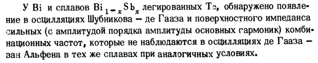 У Bi и сплавов Bi χ. Sb легированных Тз, обнаружено появление в осцилляциях Шубникова де Гааза и поверхностного импеданса сильных (с амплитудой порядка амплитуды основных гармоник) комбинационных частот, которые не наблюдаются в осцилляциях де Гааза — зан Альфена в тех же сплавах при аналогичных условиях.