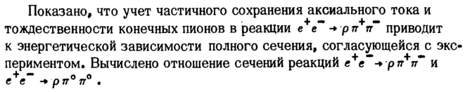 Показано, что учет частичного сохранения аксиального тока и тождественности конечных пионов в реакции е+е~ ρ π*π~ приводит к энергетической зависимости полного сечения, согласующейся с экспериментом. Вычислено отношение сечений реакций рп*тГ и -*-ρπ°π° .