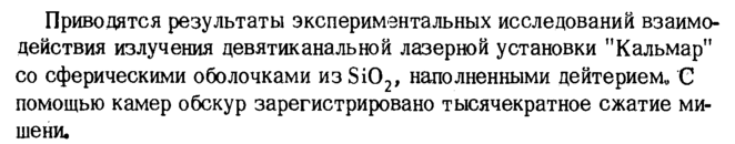 Приводятся результаты экспериментальных исследований взаимодействия излучения девятиканальной лазерной установки "Кальмар" со сферическими оболочками из Si02, наполненными дейтерием* С помощью камер обскур зарегистрировано тысячекратное сжатие мишени.