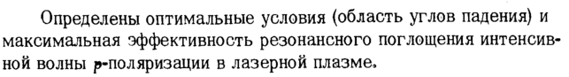 Определены оптимальные условия (область углов падения) и максимальная эффективность резонансного поглощения интенсивной волны р-поляризации в лазерной плазме»