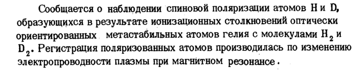 Сообщается о наблюдении спиновой поляризации атомов Η и D, образующихся в результате ионизационных столкновений оптически ориентированных метастабильных атомов гелия с молекулами Н2 и D2. Регистрация поляризованных атомов производилась по изменению электропроводности плазмы при магнитном резонансе.