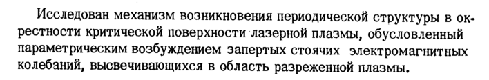 Исследован механизм возникновения периодической структуры в окрестности критической поверхности лазерной плазмы, обусловленный параметрическим возбуждением запертых стоячих электромагнитных колебаний, высвечивающихся в область разреженной плазмы.