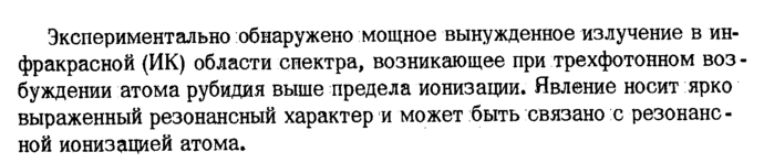 Экспериментально обнаружено мощное вынужденное излучение в инфракрасной (ИК) области спектра, возникающее при трехфотонном воз -буждении атома рубидия выше предела ионизации. Явление носит ярко выраженный резонансный характер и может быть связано с резонансной ионизацией атома.
