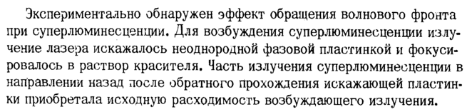 Экспериментально обнаружен эффект обращения волнового фронта при супер люминесценции. Для возбуждения суперлюминесценции излучение лазера искажалось неоднородной фазовой пластинкой и фокусировалось в раствор красителя. Часть излучения суперлюминеоценции в направлении назад после обратного прохождения искажающей пластинки приобретала исходную расходимость возбуждающего излучения.