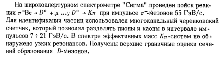 На широкоапертурном спектрометре "Сигма" проведен пойск реакции 7т-~Ве -*Ό° + μ -> Κπ при импульсе /г~ Сезонов 55 ГэВ/с. Для идентификации частиц использовался многоканальный черенковский счетчик, который позволял разделять пионы и каоны в интервале импульсов 7^-21 ГэВ/с. В спектре эффективных масс Хтг-Систем не обнаружено узких резонансов. Получены верхние граничные оценки сечений образования D-ivie30H0B.