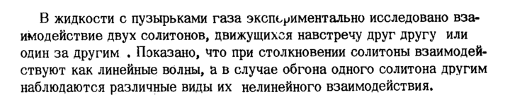 В жидкости с пузырьками газа экспериментально исследовано взаимодействие двух солитонов, движущихся навстречу друг другу или один за другим . Показано, что при столкновении солитоны взаимодействуют как линейные волны, а в случае обгона одного солитона другим наблюдаются различные виды их нелинейного взаимодействия.