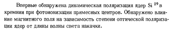 Впервые обнаружена динамическая поляризация ядер Si2 в кремнии при фотоионизации примесных центров. Обнаружено влияние магнитного поля на зависимость степени оптической поляризации ядер от длины волны света накачки.