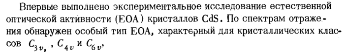 Впервые выполнено экспериментальное исследование естественной оптической активности (ЕОА) кристаллов CdS. По спектрам отражения обнаружен особый тип ЕОА, характерный для кристаллических клао С0В C3v, · С4*и C6v>