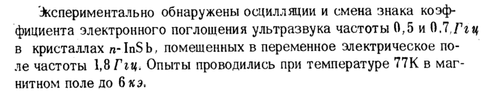 Экспериментально обнаружены осцилляции и смена знака коэффициента электронного поглощения ультразвука частоты 0,5 и 0.7,Лг«< в кристаллах n-InSb, помешенных в переменное электрическое поле частоты 1,8 Ггц. Опыты проводились при температуре 77К в магнитном поле до бкэ,