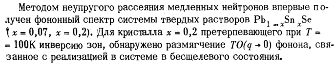Методом неупругого рассеяния медленных нейтронов впервые π о-лучен фононный спектр системы твердых растворов РЦ ^SnJSe \ χ = 0,07, χ ~ 0,2). Для кристалла χ = 0,2 претерпевающего при Г = = 100К инверсию зон, обнаружено размягчение TO(q -* 0) фонона, связанное с реализацией в системе в бесщелевого состояния.