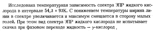 Исследована температурная зависимость спектра ЭПР жидкого кислорода в интервале 54,'ό * 9<Ж. С понижением температуры ширина линии в спектре увеличивается и максимум смещается в сторону малых полей. При этом вид спектра ЭПР жидкого кислорода не испытывает скачка при фазовом переходе жидкость — у-кислород ,