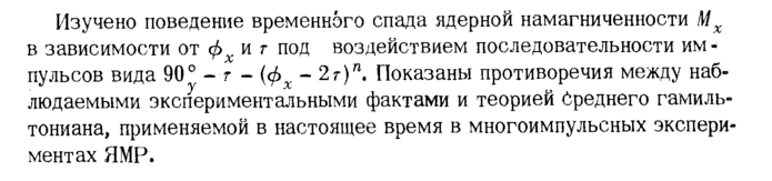 Изучено поведение временного спада ядерной намагниченности Μχ в зависимости от фх и г под воздействием последовательности импульсов вида 90° τ (φχ 2г)п. Показаны противоречия между наблюдаемыми экспериментальными фактами и теорией бреднего гамильтониана, применяемой в настоящее время в многоимпульсных экспериментах ЯМР.