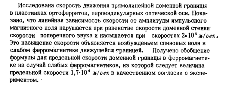 Исследована скорость Движения прямолинейной доменной границы в пластинках ортоферритов, перпендикулярных оптической оси. Показано, что линейная зависимость скорости от амплитуды импульсного магнитного поля нарушается при равенстве скорости доменной стенки скорости поперечного звука и насыщается при скоростях 2*104 м/сек. Это насыщение скорости объясняется возбуждением спиновых волн в слабом ферромагнетике движущейся границей, ' Получено обобщение формулы для предельной скорости доменной границы в ферромагнетике на случай слабых ферромагнетиков, из которой следует величина предельной скорости 1,7* 104 м/сек в качественном согласии с экспериментом. ■