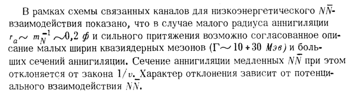 В рамках схемы связанных каналов для низкоэнергетического NN-взаимодействия показано, что в случае малого радиуса аннигиляции гаг^ mNl φ и сильного притяжения возможно согласованное описание малых ширин квазиядерных мезонов (Г^ 10 + 30 Мэв) и больших сечений аннигиляции. Сечение аннигиляции медленных NN при этом отклоняется от закона 1/^Характер отклонения зависит от потенци-ааьного взаимодействия NN.