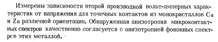 Измерены зависимости второй производной вольт-амперных характеристик от напряжения для точечных контактов из монокристаллов Си и Zn различной ориентации. Обнаруженная анизотропия микроконтактных спектров качественно согласуется с анизотропией фононных спектров этих металлов. 1