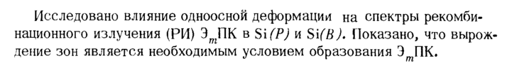 Исследовано влияние одноосной деформации на спектры рекомби-национного излучения (РИ) ЗтПК в Si(P) и Si(B). Показано, что вырождение зон является необходимым условием образования Э ПК.