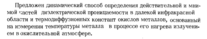 Предложен динамический способ определения действительной и мнимой частей диэлектрической проницаемости в далекой инфракрасной области и термодиффузионных констант окислов металлов, основанный на измерении температуры металла в процессе его нагрева излучением в окислительной атмосфере.
