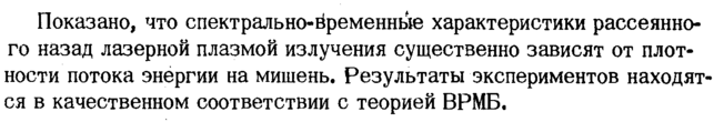 Показано, что спектрально-временные характеристики рассеянного назад лазерной плазмой излучения существенно зависят от плотности потока энергии на мишень. Результаты экспериментов находятся в качественном соответствии с теорией ВРМБ.