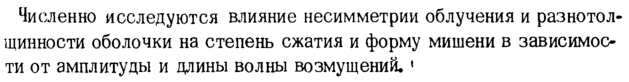 Численно исследуются влияние несимметрии облучения и разнотол-щинности оболочки на степень сжатия и форму мишени в зависимости от амплитуды и длины волны возмущений,<
