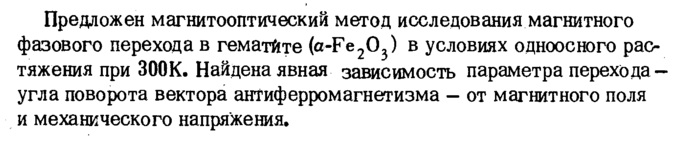Предложен магнитооптический метод исследования магнитного фазового перехода в гематйте (a-Fe203) в условиях одноосного растяжения при ЗООК. Найдена явная зависимость параметра перехода -угла поворота вектора антиферромагнетизма — от магнитного поля и механического напряжения.