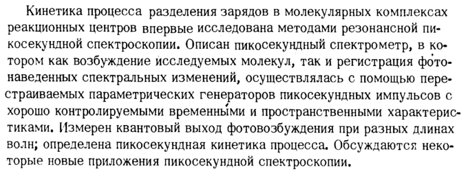 Кинетика процесса разделения зарядов в молекулярных комплексах реакционных центров впервые исследована методами резонансной пи-косекундной спектроскопии. Описан пикосекундный спектрометр, в котором как возбуждение исследуемых молекул, так и регистрация фо'то-наведенных спектральных изменений, осуществлялась с помощью перестраиваемых параметрических генераторов пикосекундных импульсов с хорошо контролируемыми временными и пространственными характеристиками. Измерен квантовый выход фотовозбуждения при разных длинах волн; определена пикосекундная кинетика процесса. Обсуждаются некоторые новые приложения пикосекундной спектроскопии.