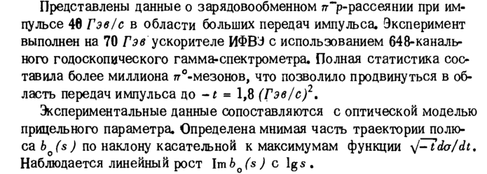 Представлены данные о зарядовообменном я-~р-рассеянии при импульсе 4Θ Гэв/с в области больших передач импульса. Эксперимент выполнен на 70 Гэв ускорителе ИФВЭ с использованием 648-каналь-ного годоскопического гамма-спектрометра. Полная статистика составила более миллиона π "-мезонов, что позволило продвинуться в область передач импульса до -t = 1,8 (Гэв/с)2. Экспериментальные данные сопоставляются с оптической моделью прицельного параметра. Определена мнимая часть траектории полюса bo(s) по наклону касательной к максимумам функции \p~tialit. Наблюдается линейный рост \m.bQ(s) с lgs.