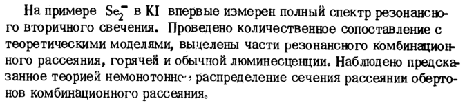 На примере Se£" в KI впервые измерен полный спектр резонансного вторичного свечения. Проведено количественное сопоставление с теоретическими моделями, выделены части резонансного комбинационного рассеяния, горячей и обычной люминесценции» Наблюдено предсказанное теорией немонотонное распределение сечения рассеянии обертонов комбинационного рассеянияс