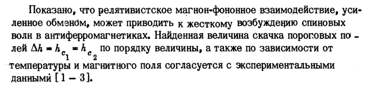 Показано, что релятивистское магнон-фононное взаимодействие, усиленное обменам, может приводить к жесткому возбуждефпо спиновых волн в антиферромагнетиках. Найденная величина скачка пороговых по -лей ΔΑ * hc =hc по порядку величины, а также по зависимости от X 2 температуры и магнитного поля согласуется с экспериментальными данными [ 1 — 3 ].