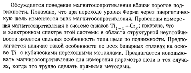 Обсуждается поведение магнитосопротивления вблизи порогов подвижности. Показано, что при переходе уровня Ферми через энергетическую щель изменяется знак магнитосопротивления. Проведены измерения магнитосопротивления в системе сплавов Ύ\ι_χ Сг^; показано, что в электронном спектре этой системы в области структурной неустойчивости имеется сильная особенность типа щели по подвижности. Предполагается наличие такой особенности во всех бинарных сплавах на основе Τϊ с кубическими переходными металлами. Предлагается использовать магнитосопротивление для измерения параметра щели в тех случаях, когда это трудно сделать прямыми методами.