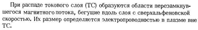 При распаде токового слоя (ТС) образуются области перезамкнувшегося магнитного потока, бегущие вдоль слоя с сверхальфеновской скоростью. Их размер определяется электропроводностью в плазме вне ТС.