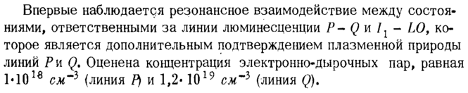Впервые наблюдается резонансное взаимодействие между состояниями, ответственными за линии люминесценции Q и ϊχ LO, которое является дополнительным подтверждением плазменной природы линий Ρ и (λ Оценена концентрация электронно-дырочных пар, равная 1-1018 слГ3 (линия Р) и 1,2· 1019 см"3 (линия Q).