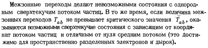 Межзонные переходы делают невозможными состояния с однородным сверхтекучим потоком частиц. В то же время, если величина межзонных переходов ТаЬ не превышает критического значения ТаЬ, оказываются возможными сверхтекучие состояния с зависящим от координат потоком частиц и отличным от нуля средним потоком (это Достижимо для пространственно разделенных электронов if дырок).