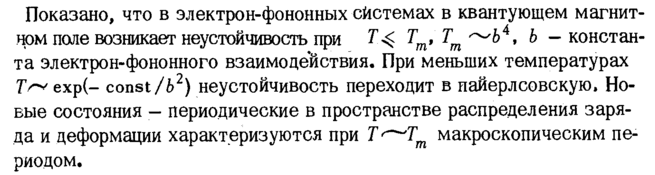 Показано, что в электрон-фононных сйстемах в квантующем магнитном поле возникает неустойчивость при Тт, Τ ~64, Ь — константа электрон-фононного взаимодействия. При меньших температурах 7>*ехр(const /Ь2) неустойчивость переходит в пайерлсовскую. Новые состояния периодические в пространстве распределения заряда и деформации характеризуются при Т<—Тт макроскопическим периодом.