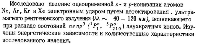 Исследовано явление одновременной s и р-ионизации атомов Ne, Аг, Кг и Хе электронным ударом путем детектирования . ультра-мягкого рентгеновского излучения (λλ 40 120 им), возникающего при распаде состояний ns пр5 (ХР°9 3?2°10) двухкратных ионов. Изучены энергетические зависимости и количественные характеристики исследованного явления.