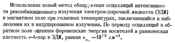 Использован новый метод обнаружения осцилляций интенсивности рекомбинационного излучения электрон-дырочной жидкости (ЭДЖ) в магнитном поле при гелиевых температурах, заключающийся в наблюдении их в индуцированном излучении. По периоду осцилляций в обратном поле оценены фермиевские энергии носителей и равновесная плотность е-А-пар в ЭДЖ, равная по ^1018 см~*т