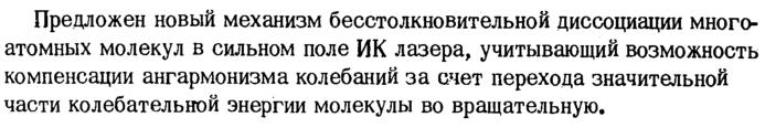 Предложен новый механизм бесстолкновительной диссоциации многоатомных молекул в сильном поле ИК лазера, учитывающий возможность компенсации ангармонизма колебаний за счет перехода значительной части колебательной энергии молекулы во вращательную.