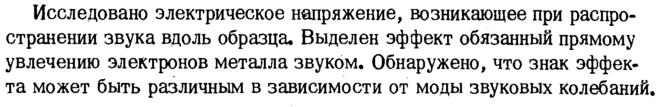 Исследовано электрическое напряжение, возникающее при распространении звука вдоль образца. Выделен эффект обязанный прямому увлечению электронов металла звуком. Обнаружено, что знак эффекта может быть различным в зависимости от моды звуковых колебаний.