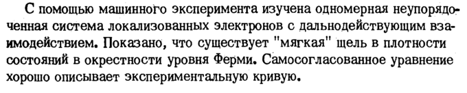 С помощью машинного эксперимента изучена одномерная неупорядоченная система локализованных электронов с дальнодействующмм взаимодействием. Показано, что существует "мягкая" щель в плотности состояний в окрестности уровня Ферми. Самосогласованное уравнение хорошо описывает экспериментальную кривую.
