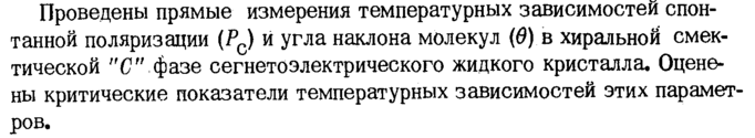 Проведены прямые измерения температурных зависимостей спонтанной поляризации (Рс) й угла наклона молекул (0).в хиральной смек-тической "С".фазе сегнетоэлектрического жидкого кристалла. Оценены критические показатели температурных зависимостей этих параметров.