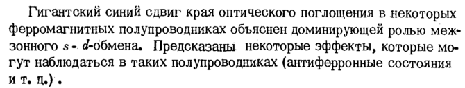 Гигантский синий сдвиг края оптического поглощения в некоторых ферромагнитных полупроводниках объяснен доминирующей ролью межзонного 5 J-обмена. Предсказанынекоторые эффекты, которые могут наблюдаться в таких полупроводниках (антиферронные состояния и т. д.) .