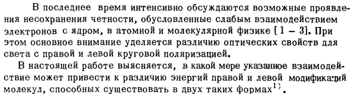 В последнее время интенсивно обсуждаются возможные проявления несохранения четности, обусловленные слабым взаимодействием электронов с ядром, в атомной и молекулярной физике [1-3]. При этом основное внимание уделяется различию оптических свойств для света с правой и левой круговой поляризацией. В настоящей работе выясняется, в какой мере указанное взаимодействие может привести к различию энергий правой и левой модификаций молекул, способных существовать в двух таких формах1'.