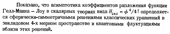 Показано, что асимптотика коэффициентов разложения функции Гелл-Манна Лоу в скалярных теориях вида Hint = ф 4/4! определяется сферически-симметричными решениями классических уравнений в эвклидовом 4-х мерном пространстве и квантовыми флуктуациями вблизи этих решений.